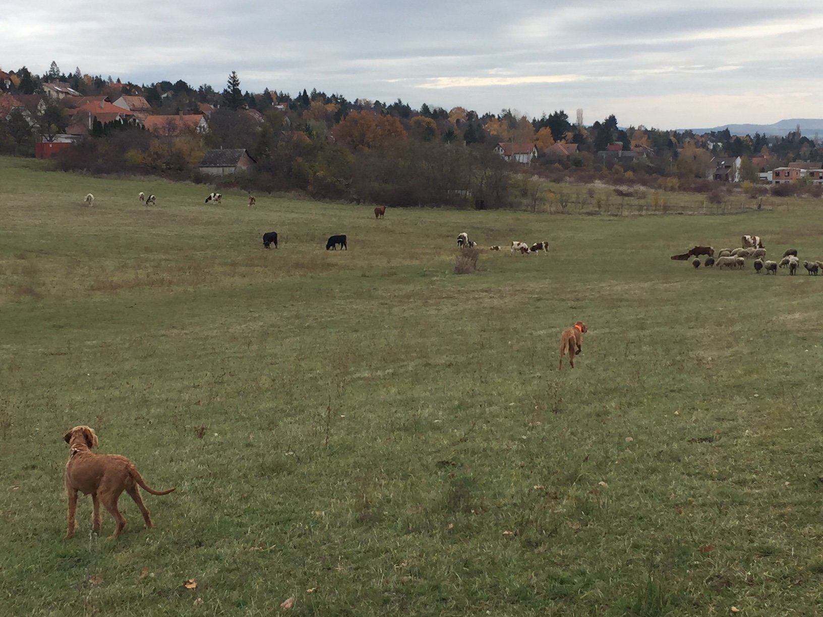 Van egy rétünk. Elit rét. Nem csak a miénk mondjuk, oké, de a bandáé. Nehezen engedünk be bárkit is a közösségbe, elég összeszokott a csapat. Persze, mi vizslák képviseljük a többséget, de azért még a mi fajtánkon kívül is vannak egészen jófejek, például két goldie, meg egy nagy benga állat, a Berci, aki olyan, mint egy óriásira nőtt játékkutya, időnként letérdeli az egész csapatot. Meg egy boxos. Olyan furcsa, turcsi orra van. Néha csatlakozik két foltos középméretű is, de ők azán egyáltalán nem beszélgetnek velem. Szóval van Tilaj, a szépfiú, de legalább nagyon fegyelmezett, már ha a fanyar és kritikus humorral megáldott gazdája erőteljesen rászól. Aztán van még Alma és Maja hercegnő, mindketten kábé annyira vannak elkényeztetve, mint mi, bár hallottam a minap, hogy Alma ágyban is aludhat, ezt nekem például két év alatt sem sikerült elérnem. 🙁 Aztán a két goldie. Nnnna, az egyik már kamaszfiú, a másik délces legény. Ezek fiú létükre egymásba habarodtak. Nekem nincs ezzel bajom, liberális kutya vagyok. Ha nekik így jó…! Nekem Alma például néha beszól. De csak megszeppenek, vagy bebújok a Gazdám lába mögé, majd ő megmondja a magáét. Néha visszadünnyögök valamit, de én igazából csak Fülit szoktam kiosztani, ő márpedig jól bírja;). Szóval van a Bársonyos, ahol bandázunk télen-nyáron, hóban, szélben, fagyban, napsütésben. 15 perc járásnyira van a haciendától, lefele irányba. Amikor megérzem a Bársonyos szelét, akkor hátracsapom a füleim, és csak robogunk, robogunk Fülivel a mámoros tehénkaki szagú fűbe. Imádom enni is. Igazi ínycsiklandó desszert ez nekünk, vadászkutyáknak. Mostanában gyakran megfordul ott a tehéncsorda, úgyhogy állandóan van desszertünk. Felőlem, aztán kiabálhat a Gazdám, hogy NEEEEEEEEEEEEEEE, szerintem Szentendre határáig elhallik, én süketnek tettetem magam és tovább falatozok.